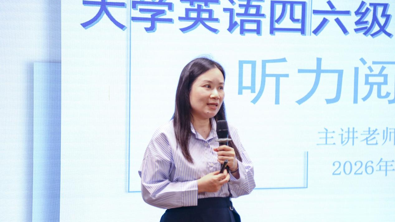 4月16日晚,外国语学院教工党支部与广州商学院学生会在第八教学楼203室联合举办广州商学院“2026春华讲坛”——大学英语四六级听力与阅读专场经验交流会。