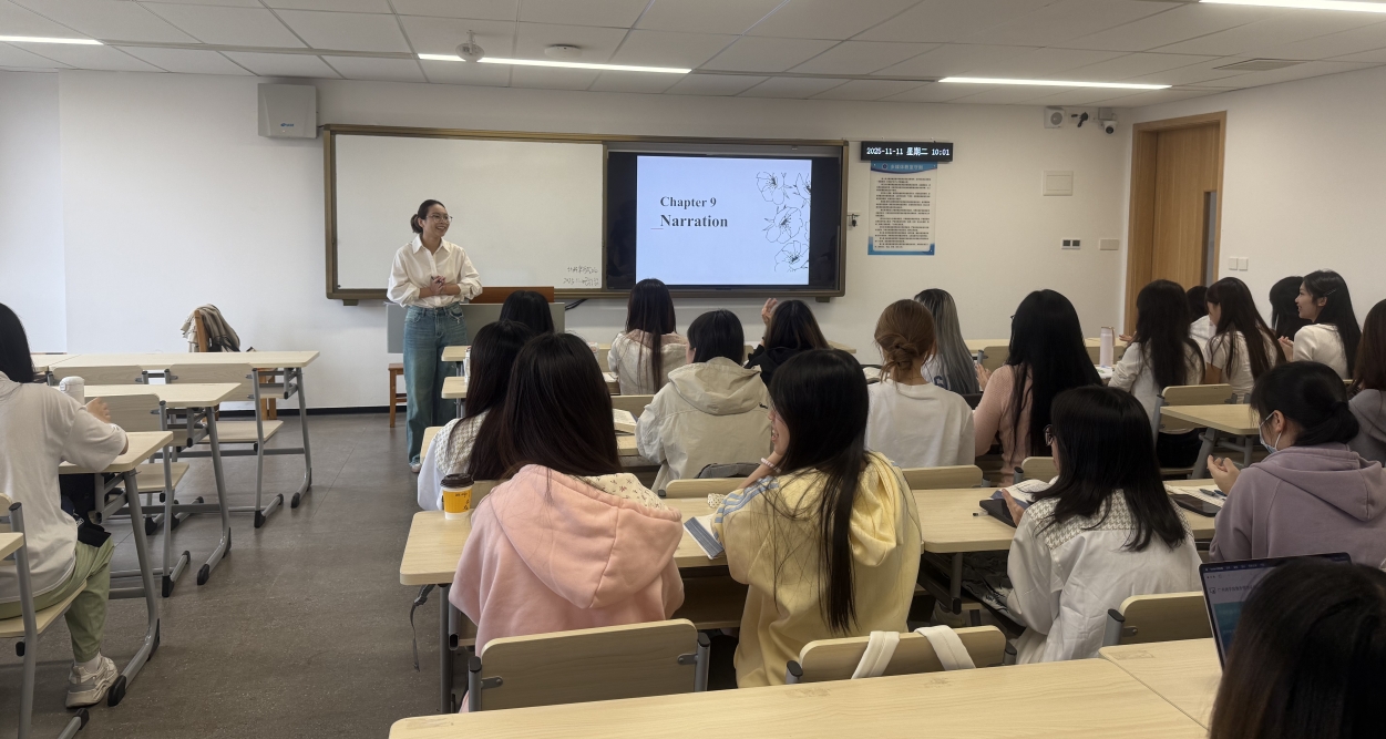 上午第三节,邵晗老师于第八教学楼516教室展示了《英语写作I》课程。本节课以“记叙文叙事技巧”为核心,教学设计环环相扣。课程伊始,邵晗老师系统阐述了记叙文的五要素(人物、情节、环境、冲突、主题)与“故事山”模型,引导学生构建完整的叙事框架。随后,她通过范文精讲,引导学生从“统一性、论据、衔接、句子技巧”四个维度解构文本,实现了理论与实践的有效结合。