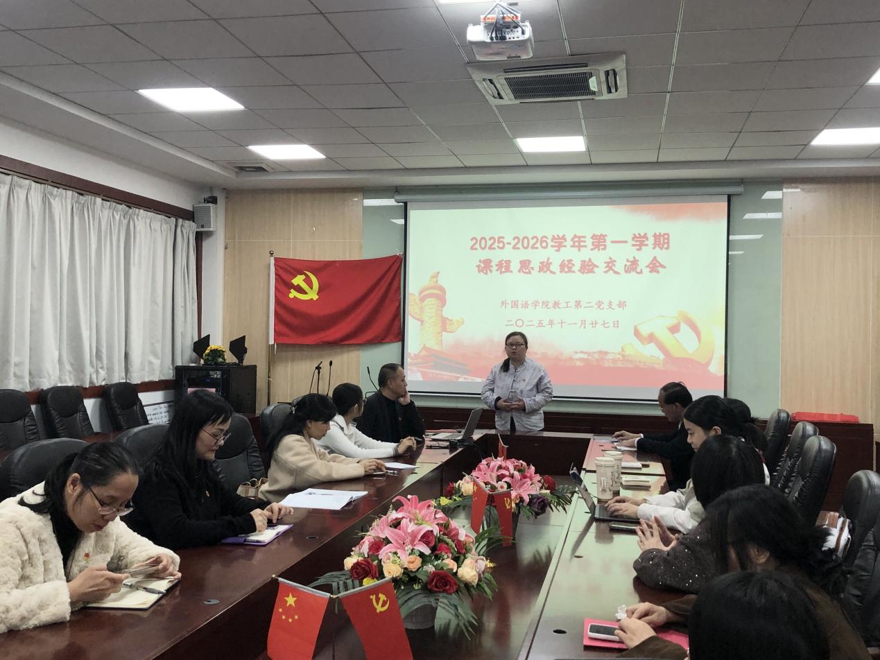 11月27日下午,外国语学院教工第二党支部于第二行政楼308室成功举办第三期课程思政经验交流会。会议由党支部书记唐海民主持,外国语学院党总支宣传委员潘文晗老师担任主讲嘉宾,党支部全体党员教师参会。