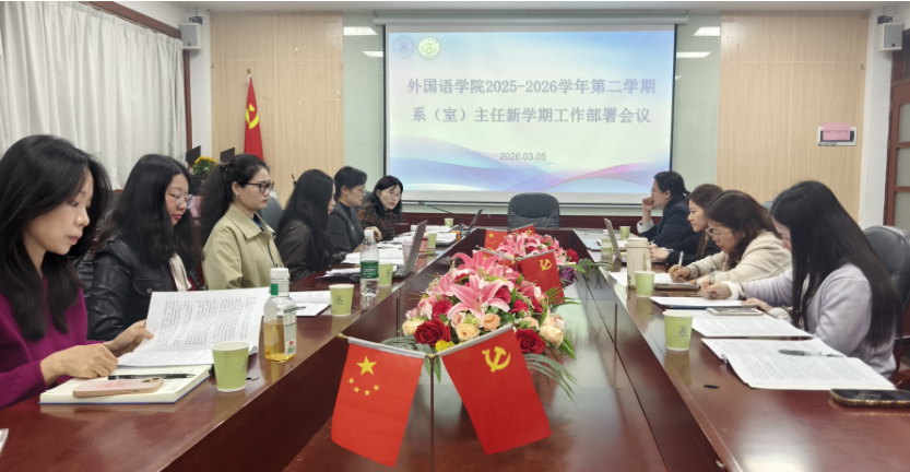 为落实学校基层教学组织建设要求,明确系(教研室)主任工作职责,细化新学期基层教学工作任务,凝聚基层教学管理力量,2026年3月6日下午,广州商学院外国语学院在第二行政楼308会议室召开2025-2026学年第二学期系(室)主任新学期工作部署会议。郭遂红院长、徐超书记、张雅敏院长助理及学院各系(教研室)主任参加会议。会议围绕基层教学组织工作部署、职责明确等核心内容有序开展,为新学期学院基层教学工作高质量推进指明方向。
