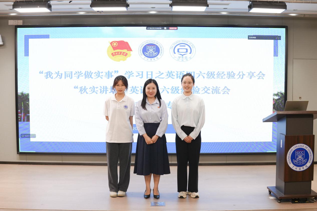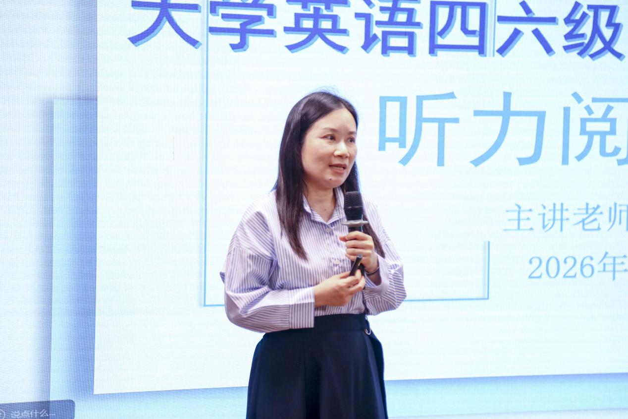 4月16日晚,外国语学院教工党支部与广州商学院学生会在第八教学楼203室联合举办广州商学院“2026春华讲坛”——大学英语四六级听力与阅读专场经验交流会。本次活动特邀外国语学院教工第二党支部宣传委员姚丽芳老师担任主讲人,并邀请国贸2403班钟梓晴同学作为学生嘉宾分享备考心得。