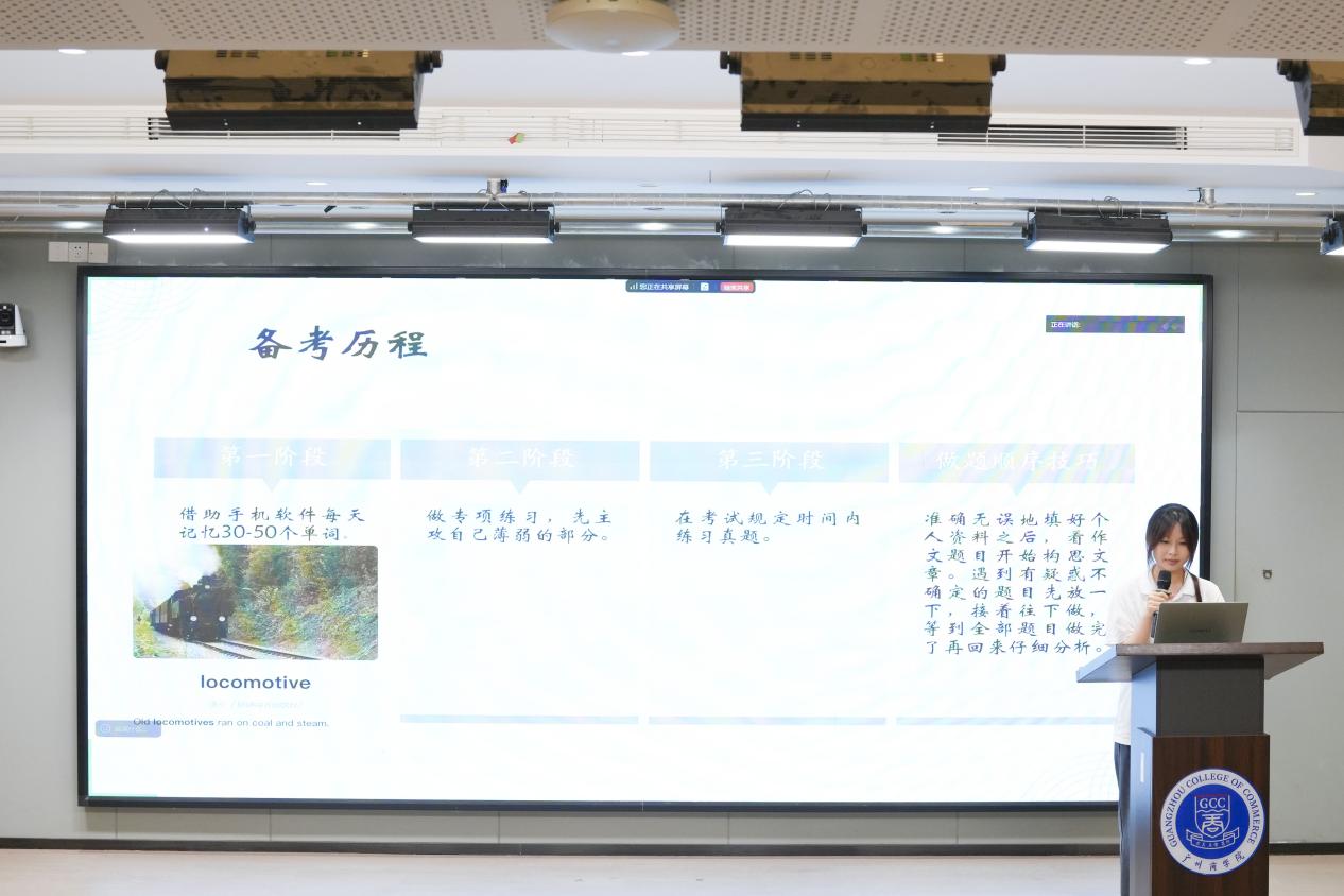 在学生分享环节,钟梓晴同学结合自身备考四级的过程,详细介绍了她的阶段性复习规划。她从最初的单词积累入手,强调词汇是基础;随后进入专项训练阶段,针对听力、阅读、写作和翻译分别进行强化练习;最后通过系统刷题来查漏补缺、提升做题速度与准确率。她的经验分享条理清晰、实操性强,赢得了在场同学的热烈掌声。