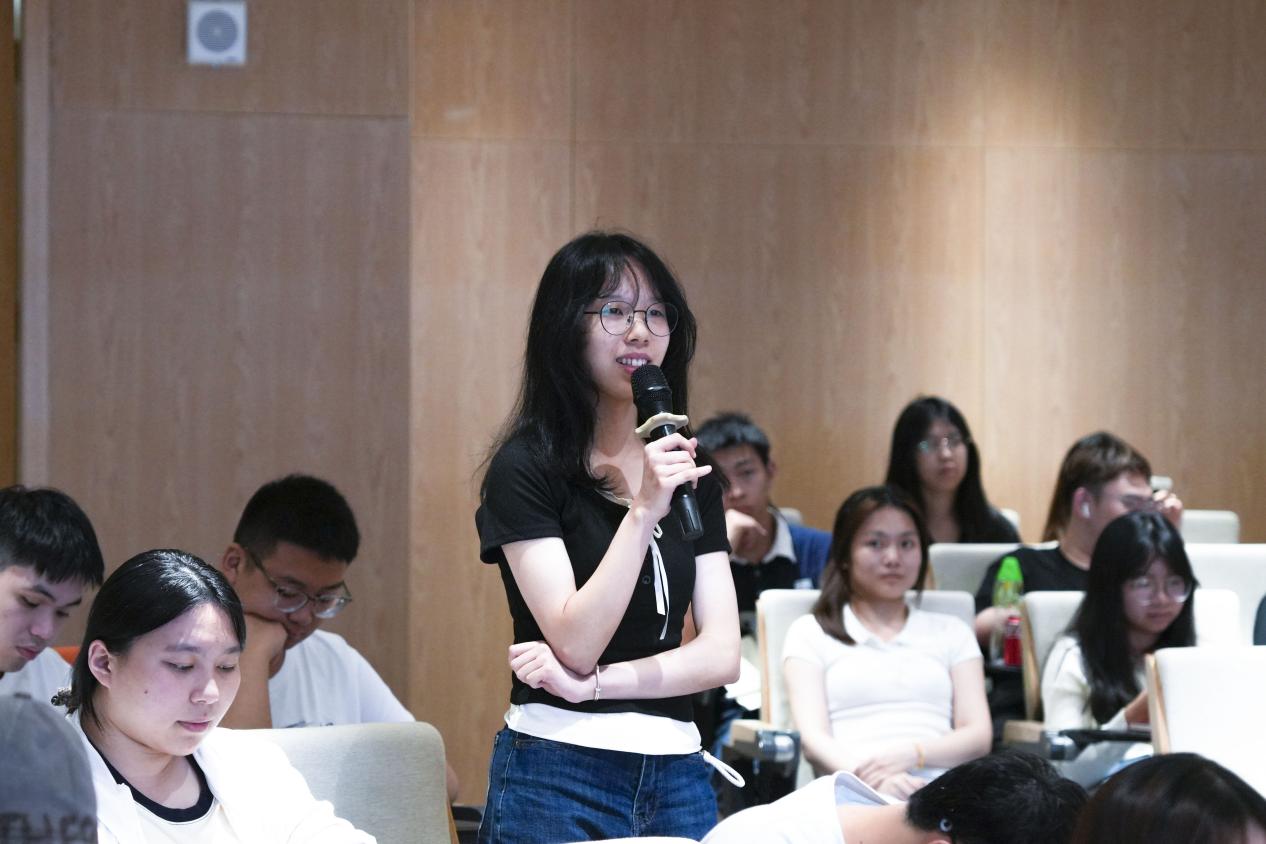 在互动提问环节,现场气氛活跃。有同学提出自己在听力过程中习惯性地将英文先转换成中文来理解,导致跟不上语速。针对这一问题,姚丽芳给出了专业建议:首先要多听、坚持听,培养耳朵对英语语音和语流的直接反应能力;其次要弄清英语语法结构,尤其是从句、倒装等常见句式,减少因句式不清而依赖翻译的习惯;最后要逐步转换语言思维,尝试直接用英语理解信息,而非借助中文中转。她鼓励同学们从短句和慢速材料开始练习,循序渐进地建立起英语思维模式。