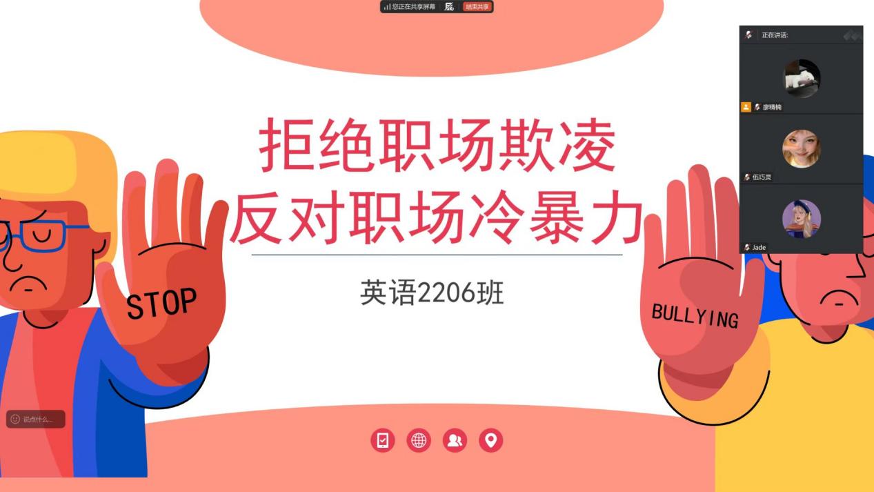 为营造和谐、尊重的职场生态,增强职场人及准职场群体对职场欺凌与冷暴力的认知能力、防范意识和应对技巧,11月1-15日,广州商学院外国语学院22级英语专业各班级组织开展了“拒绝职场欺凌、反对职场冷暴力”主题线上班会活动。本次班会由各班级团支书主持,全班同学参与。