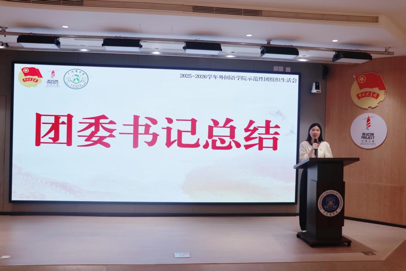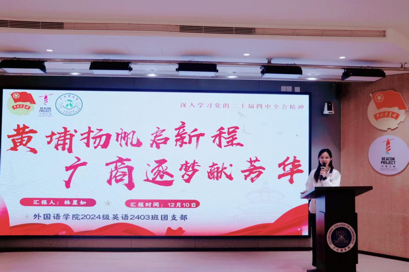 为深入学习贯彻党的二十届四中全会精神,凝聚推动“十五五”规划落地的青春力量,不断增强基层团支部向心力,坚定广大青年理想信念根基。外国语学院团委组织部于12月10日晚在第八教学楼202室举行外国语学院2025-2026学年“青春聚力强支部,示范引领谱新篇”示范性团组织生活会。出席本次活动的嘉宾有外国语学院团委书记庄菲菲、23级辅导员陈淑怡、外国语学院团委组织部部长董沛彦。