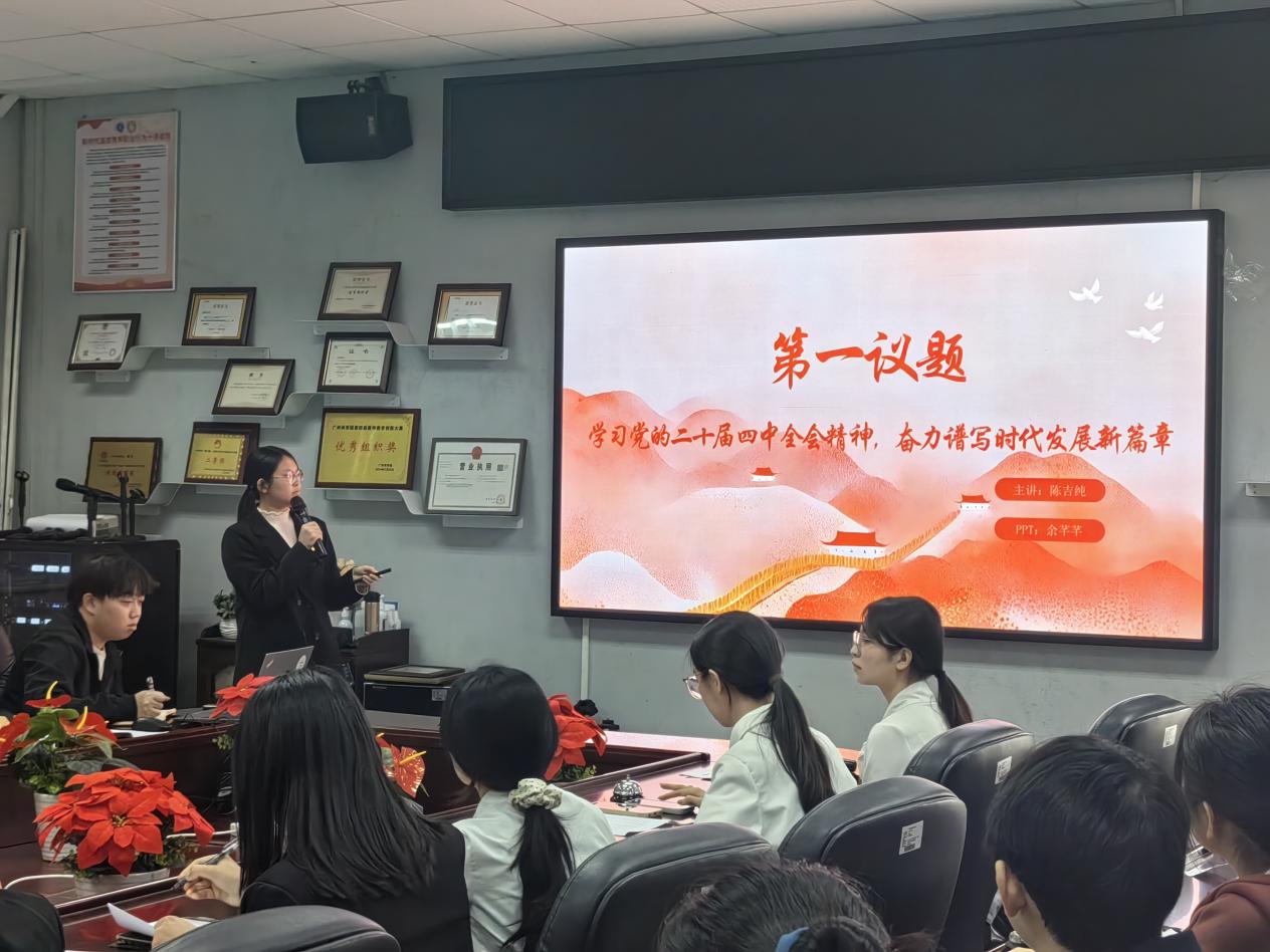 为持续推动党组织建设,进一步增强党组织的凝聚力与战斗力,优化党员队伍结构,12月9日,外国语学院学生第二党支部在艺术楼201会议室召开接收中共预备党员通表大会暨学习贯彻党的二十届四中全会精神主题党日活动。学生第二党支部书记谢敏丽、教师党员庄菲菲、陈钰洵、李思浩及支部全体学生党员参加会议。