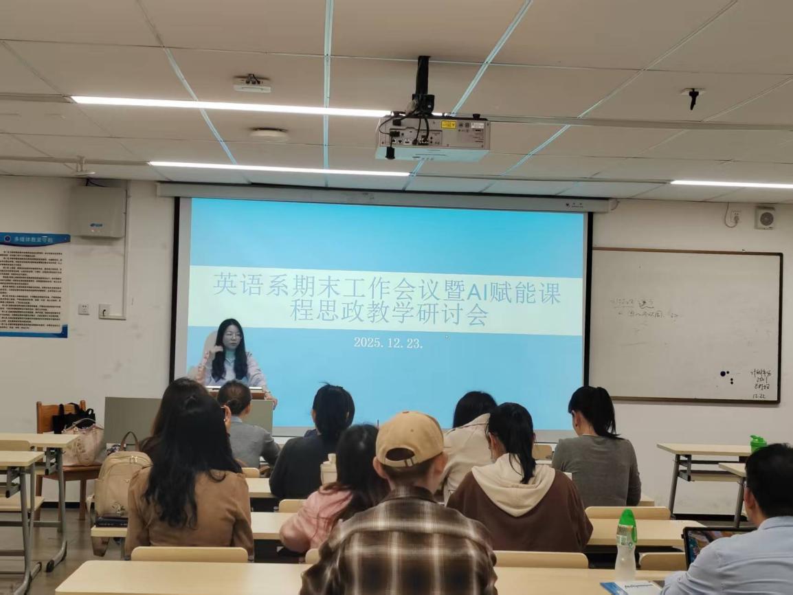 12月23日,英语系全体教师在第八教学楼509召开期末工作会议暨AI赋能课程思政教学研讨会。会议围绕期末教学考核、教务文件学习、AI赋能课程思政、个性化人才培养及产教融合推进等核心议题展开深度研讨,为学期收尾工作与教学创新筑牢根基。会议由英语系主任程瑜瑜主讲。
