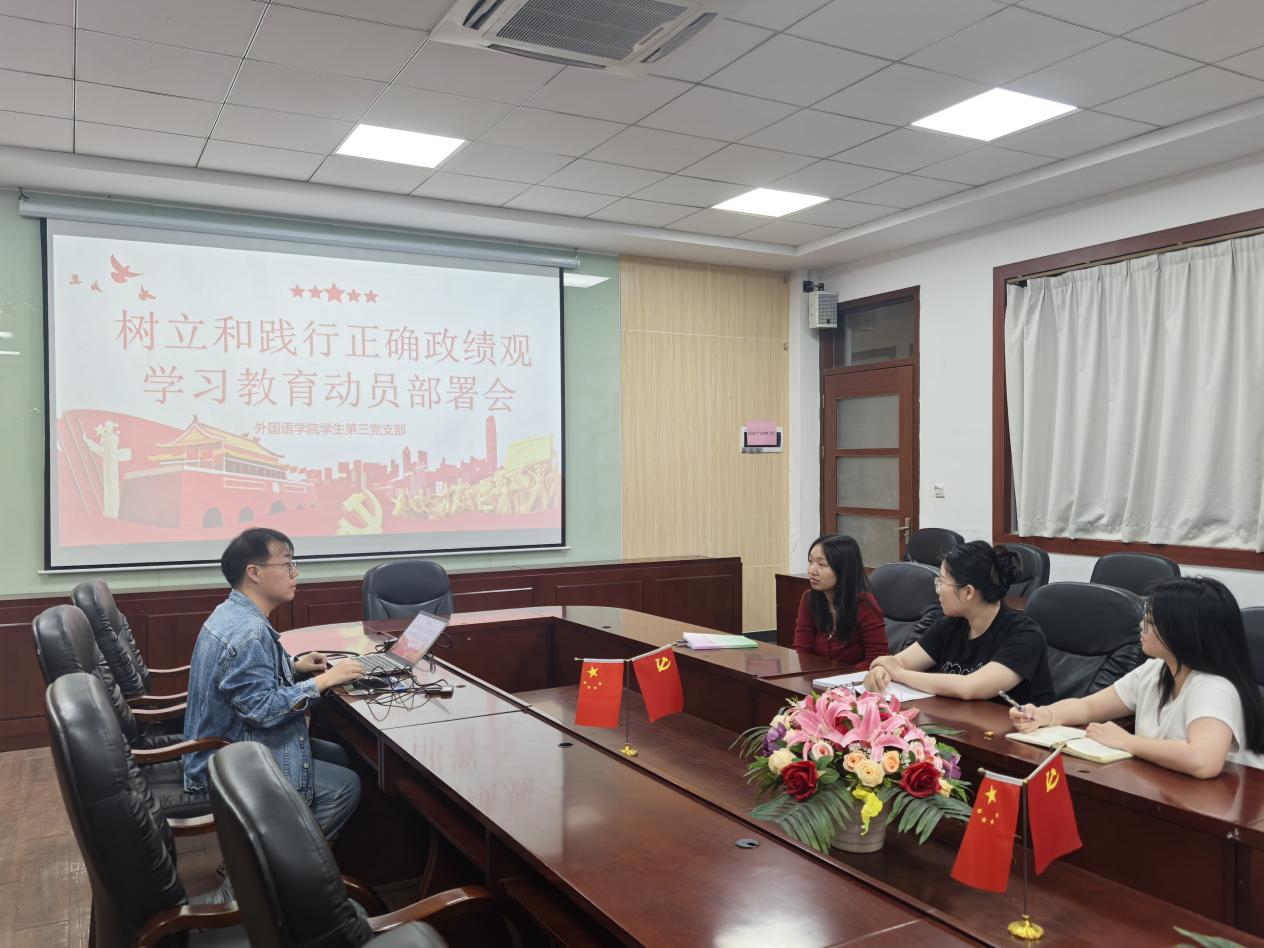 3月17日,外国语学院学生第三党支部召开树立和践行正确政绩观学习教育动员部署会。会议的主要任务是深入学习贯彻习近平总书记关于树立和践行正确政绩观的重要论述精神,安排部署支部学习教育工作,引导全体党员坚定理想信念、强化责任担当,将树立和践行正确政绩观落实到服务师生的全过程。支部全体党员参加会议。