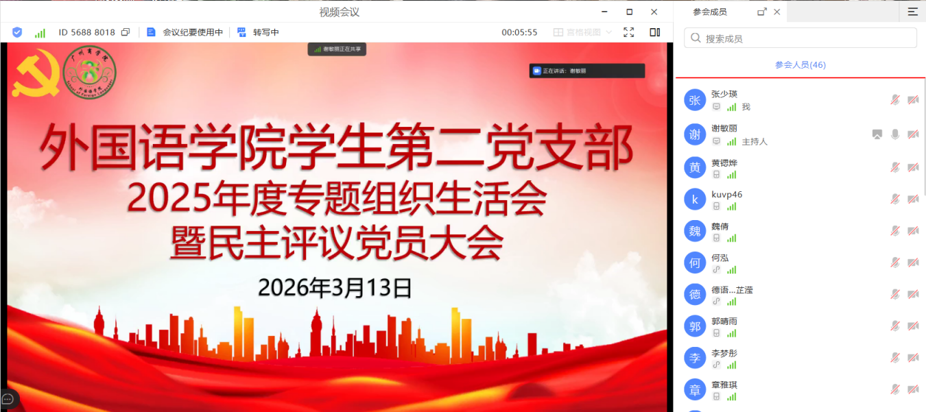 为深入学习贯彻党的二十届四中全会精神,落实中央八项规定及其实施细则精神,凝聚青年力量服务“十五五”规划落地落实,持续推进作风建设常态化长效化,3月13日晚,外国语学院学生第二党支部以线上形式召开2025年度组织生活会暨民主评议党员大会。党支部书记谢敏丽、宣传委员庄菲菲、组织委员李思浩、教师党员陈钰洵及支部全体党员参会,会议由谢敏丽主持。