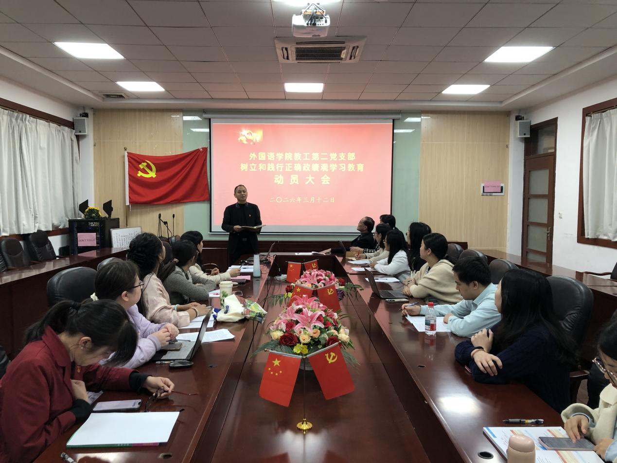 3月12日,外国语学院教工第二党支部召开树立和践行正确政绩观学习教育动员会,会议深入学习贯彻上级有关通知精神,认真学习习近平总书记关于树立和践行正确政绩观的重要论述,对支部学习教育进行全面动员部署。