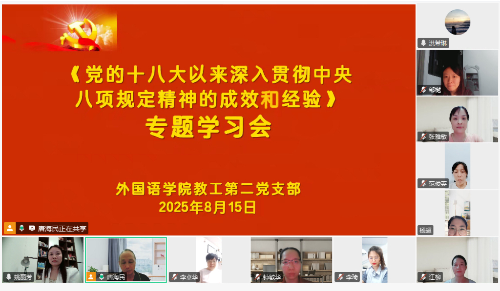 8月15日晚,外国语学院教工第二党支部在腾讯会议上召开《党的十八大以来深入贯彻中央八项规定精神的成效和经验》专题学习会,会议由党支部书记唐海民主持,全体党员参加。