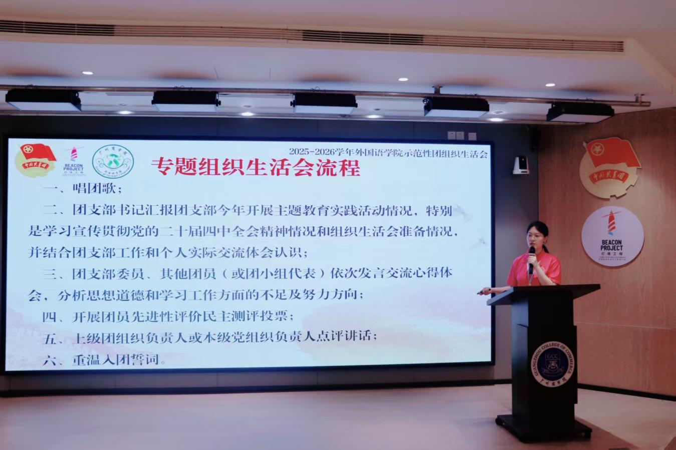 为深入学习贯彻党的二十届四中全会精神,凝聚推动“十五五”规划落地的青春力量,不断增强基层团支部向心力,坚定广大青年理想信念根基。外国语学院团委组织部于12月10日晚在第八教学楼202室举行外国语学院2025-2026学年“青春聚力强支部,示范引领谱新篇”示范性团组织生活会。出席本次活动的嘉宾有外国语学院团委书记庄菲菲、23级辅导员陈淑怡、外国语学院团委组织部部长董沛彦。