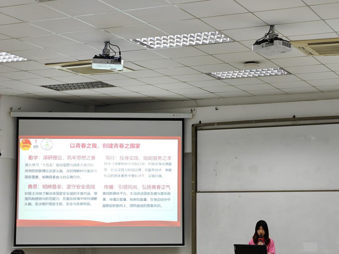 在专题学习的实践部署环节,蓝美烔以“以青春之我,创建青春之国家”为导向,为学生会明确行动路径:先以“勤学、善思、笃行、传播”为核心,深入研究“十五五”规划与总体国家安全观,筑牢思想根基、坚守安全底线,再将学习成果落于实践;她阐释了经济、人民、政治安全的内涵,同步细化落实举措:推进“三型”团支部建设,从理论研学中的政策解读,到志愿活动里的“一带一路”故事传播,外院青年要用青春的纯粹与奋斗,让语言优势成为守护国家安全、服务发展大局的青春利器。